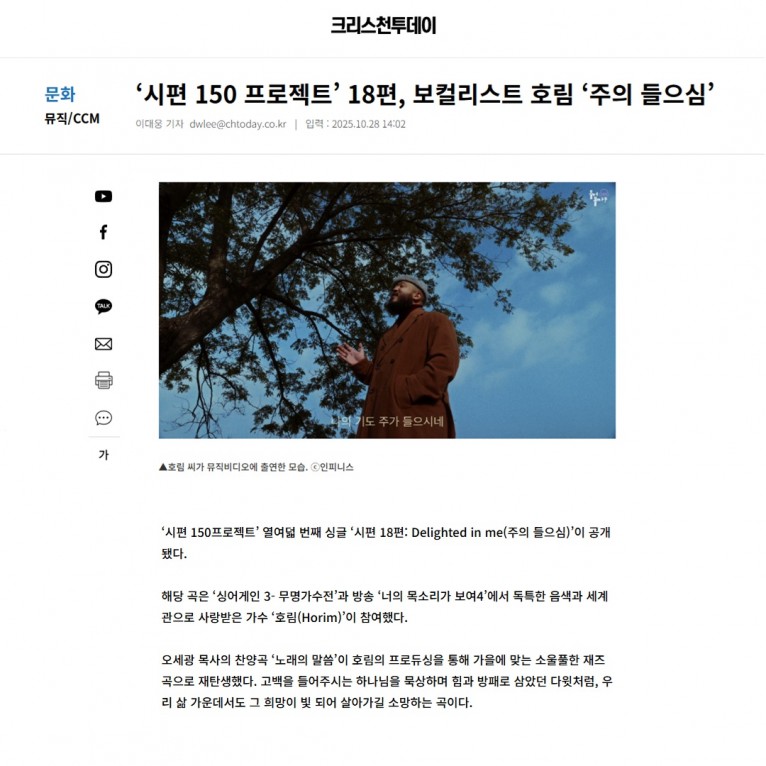 [기사] ‘시편 150 프로젝트’ 18편, 보컬리스트 호림 ‘주의 들으심’(크리스천투데이)