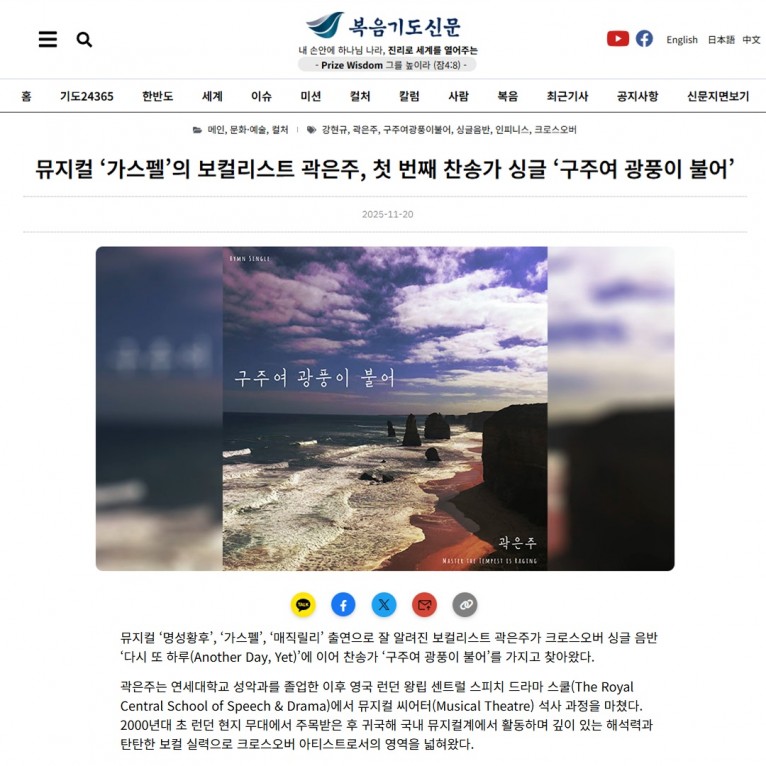 [기사] 뮤지컬 ‘가스펠’의 보컬리스트 곽은주, 첫 번째 찬송가 싱글 ‘구주여 광풍이 불어’(복음기도신문)